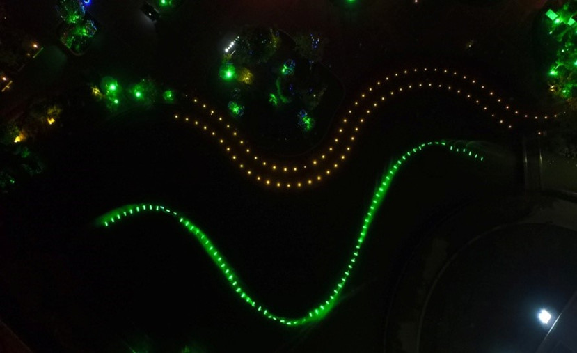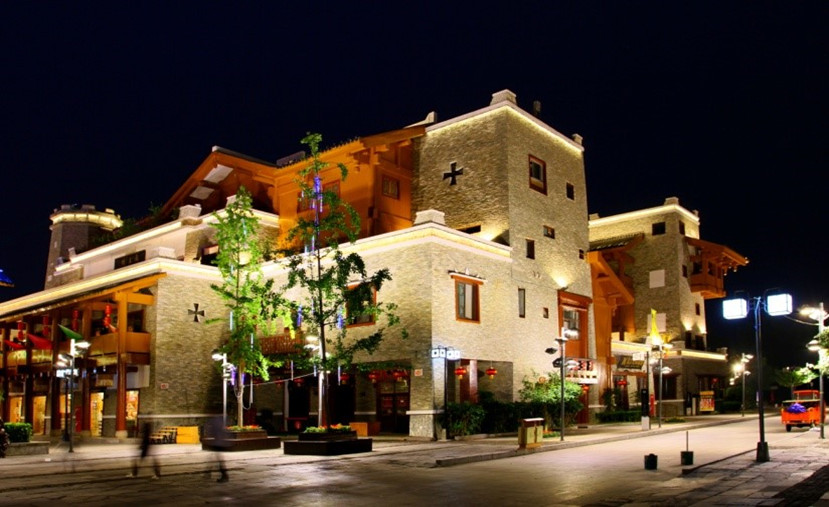 街區(qū)建筑物在房檐上設(shè)置RGB廣角小射燈,墻體中部配裝壁燈,頂部為LED洗墻燈,完整的勾勒出建筑物整體輪廓。建筑物瓦面的處理,僅采用硬條燈打亮屋脊的造型,壓低屋面整體亮度,明暗對(duì)比形成內(nèi)斂的神秘感。小投影燈在地面上投出羌族文化特色的圖案,小巧而精致,別有一番趣味