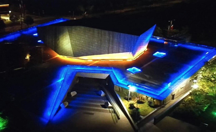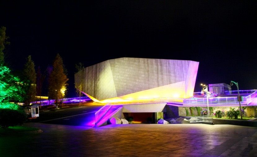 幸福館以羌族所崇拜的白石為主題。護(hù)欄中嵌入的線條燈采用密集小功率燈珠和小角度透鏡,透過玻璃圍欄照射到下方不銹鋼底座上,線條燈反射出藍(lán)寶石的效果,達(dá)到見光不見燈的效果。同時(shí)在原有藍(lán)寶石造型的玻璃天臺(tái)中加入特定波長的藍(lán)色光源,讓出光效果更為接近寶石藍(lán),成為幸福館的一大亮點(diǎn)。