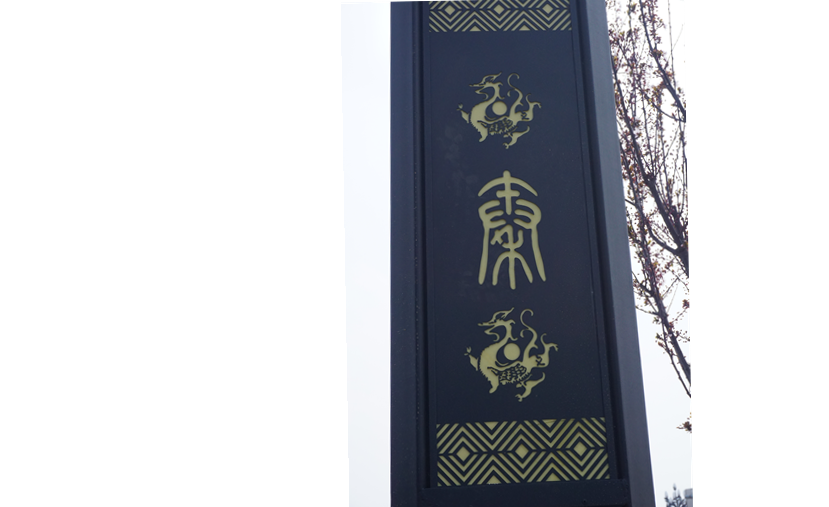 燈桿底座刻有篆體“秦”“漢”的字樣,上下圖案為秦漢時期瓦當四神獸圖案,上下條紋為秦磚圖案提煉而來。