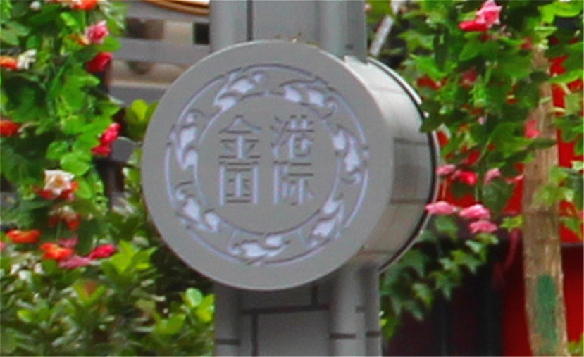 “民國風情”燈外觀色彩呈鐵灰色,燈桿使用青磚紋飾,展現出民國時期建筑特點,給人以素雅、沉穩,古樸的美感。三個燈頭采用西方庭院燈的馬燈造型,以顯示當時社會的開放性。燈臂采用中國傳統的祥云紋飾,“祥云”文化概念在中國具有上千年的時間跨度,用于此處使其更具年代感。燈桿中下部的銅質雕刻“金港國際”字樣,與地方方位名稱相得益彰,是整燈的點睛之處。