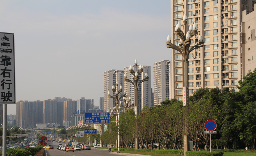 玉蘭燈,高15.08米,既有主光源,又有裝飾光源,皆采用LED,彰顯節能環保理念,既滿足了二郎迎賓大道和科成路路段的照明需求,同時也能起到裝飾美化城區面貌的作用。