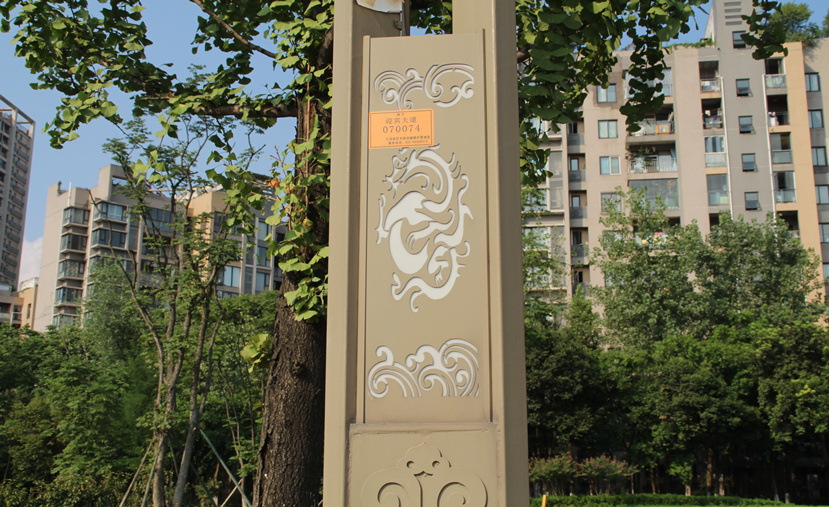 建立于春秋戰國時期的巴國以重慶為中心,創造了自己的文化,即巴文化,并且這種文化一直延續至今,成為連接古今巴文化的重要紐帶。設計者提取巴文化元素,在玉蘭燈底座采用巴文化花紋做浮雕。燈桿中部安裝兩個燈箱,上面的紋飾采用高新區和工業城的LOGO,并雕刻“高新九龍坡”和“百年工業城”的字樣紋飾。燈桿下部分雕刻龍紋紋飾,與地方方位名稱相得益彰,象征九龍坡。