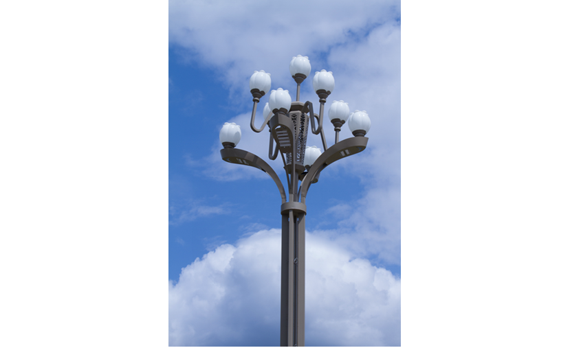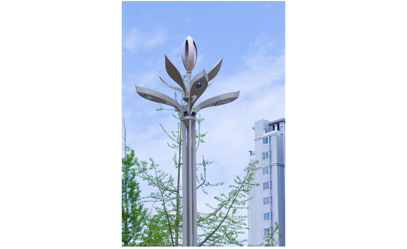 春意盎然景觀燈,寓意國民經濟就像春天充滿生機,錚錚向榮之意;燈具的設計主要通過花卉造型進行抽象設計而來,結合現代工藝轉化為集景觀與功能照明為一體的戶外照明工具;燈桿主體、桿體、底座材質均為金屬鋼件,表面熱浸鋅后噴塑處理。