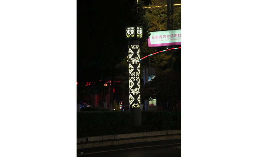 安裝于香格里拉大道中間綠化帶區域的景觀燈柱,以納西族民族傳統紋飾為元素,加入東巴文字“麗江”,頂部融入納西族族徽,整燈造型穩重大氣而富有文化韻味,有了景觀燈柱作為大道玉蘭燈的補充,香格里拉大道的白天更加美觀,夜景更加靚麗。