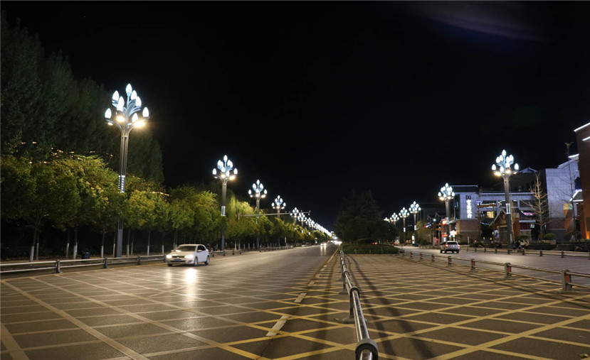 華體照明根據麗江市擁有眾多少數民族的特點,為其量身定制了八叉九火玉蘭燈500多套、雙頭庭院步道燈390多套和景觀燈柱50多套,分別布局在香格里拉大道的大道旁、人行道旁和大道中間的綠化帶區域。