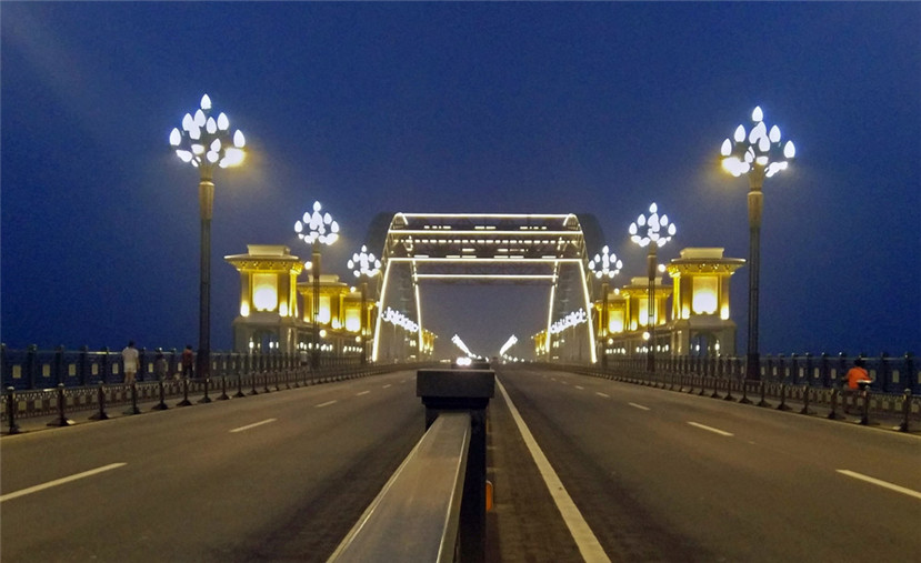 李城大橋本身在結構設計上就有很好的景觀橋的特點,華體照明經典玉蘭燈安裝在橋上,白天玉蘭燈與形態優美的大橋很好地融合在一起,起到了很好的裝飾作用,夜晚與大橋橋身的亮化燈具結合在一起,成為夜晚大橋上一道靚麗的景觀。