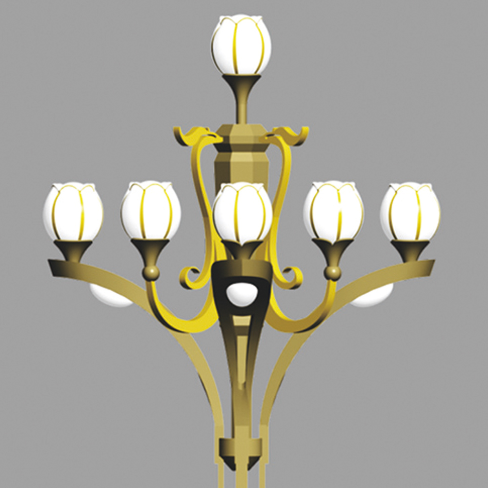 燈型主體、桿體、底座材質為金屬鋼件表面熱鍍噴塑,燈罩采用花形玻璃罩,燈具為鋁件,可配光源LED/鈉燈。