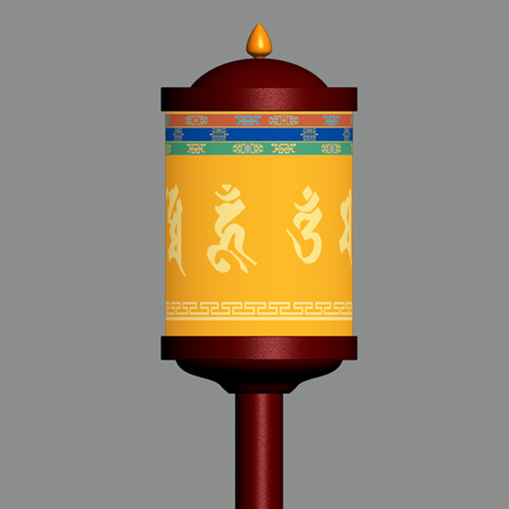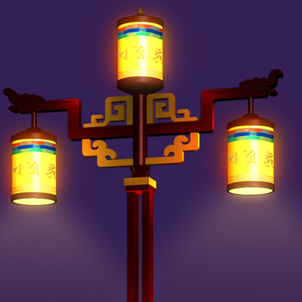 本款燈型具有典型的藏族韻味,藏紅色、藏金色的巧妙運用,配合頂部轉金筒裝飾,讓燈具更具地域獨特性,底座鏤空藏傳佛教“蓮花”及壽紋圖案,使得燈具細節更豐富飽滿。