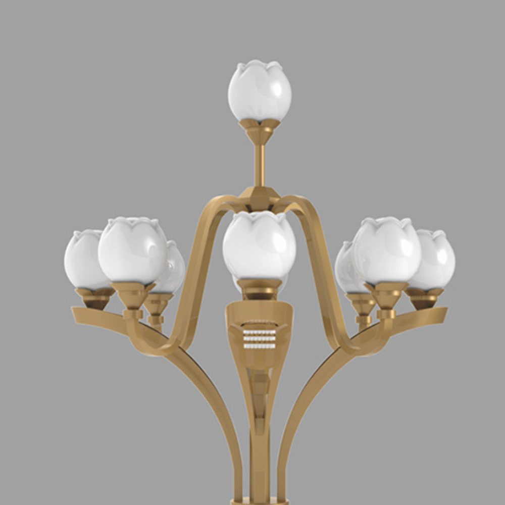 中華燈是一款極具中國特色,外觀大方的多等頭燈具。芙蓉中華燈是在傳統中華燈的基礎上進行了改良,保留其神韻,切加入新的元素,巧妙的運用花瓣的形式,實現了燈桿與燈頭的實體連接;