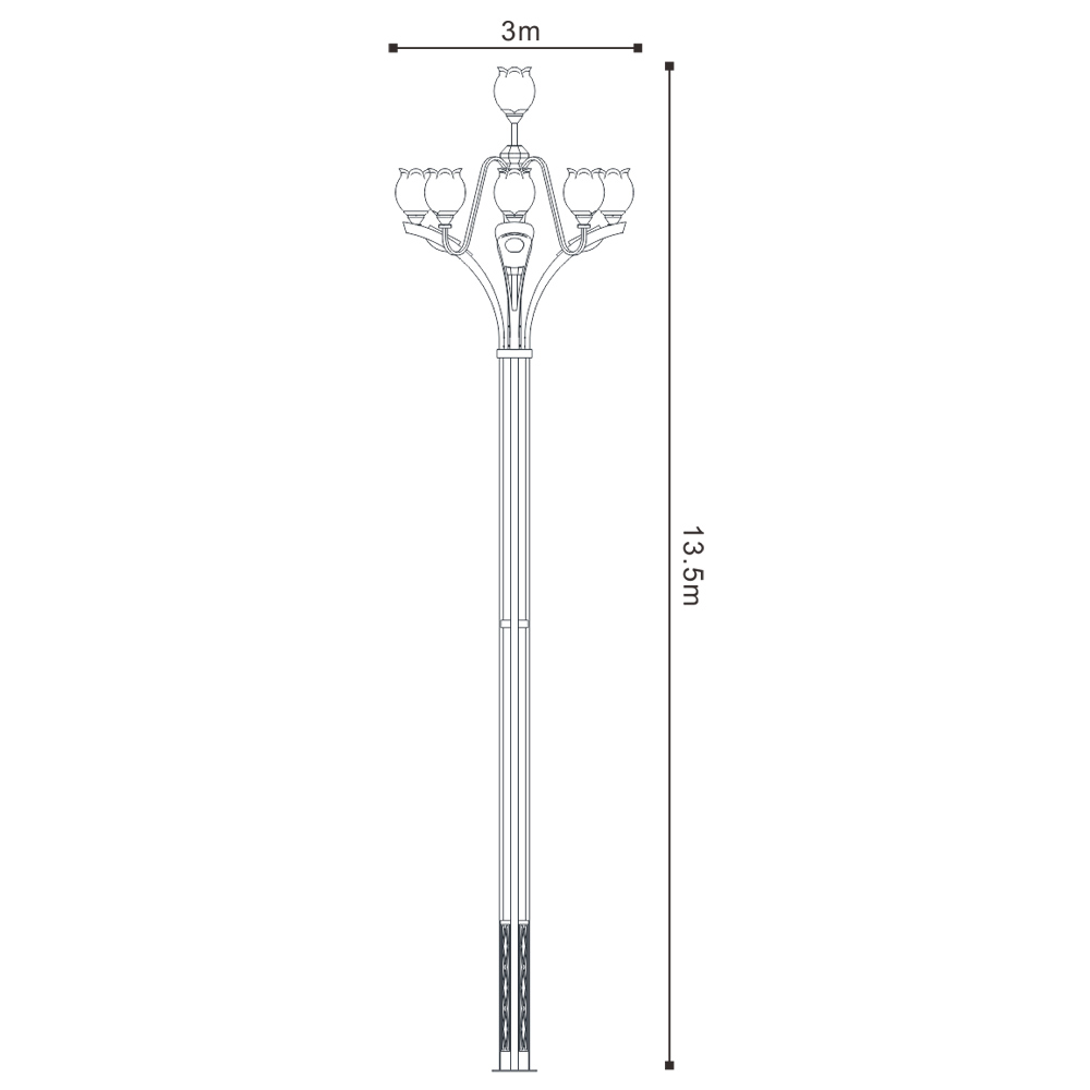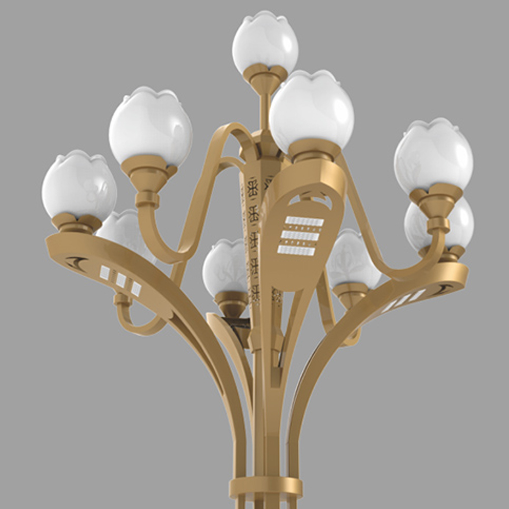 該款燈可以在原有景觀照明基礎上,增加了功能照明,使功能照明和景觀照明完美結合。可將LED光源巧妙的配置于戶外文化定制燈具中,替代傳統鈉燈及節能燈光源,使用革命性創新,在不影響使用及美觀的情況下,降低該類裝飾性景觀路燈的功率密度,切可在桿體內側加裝華體單燈智能照明管理系統。