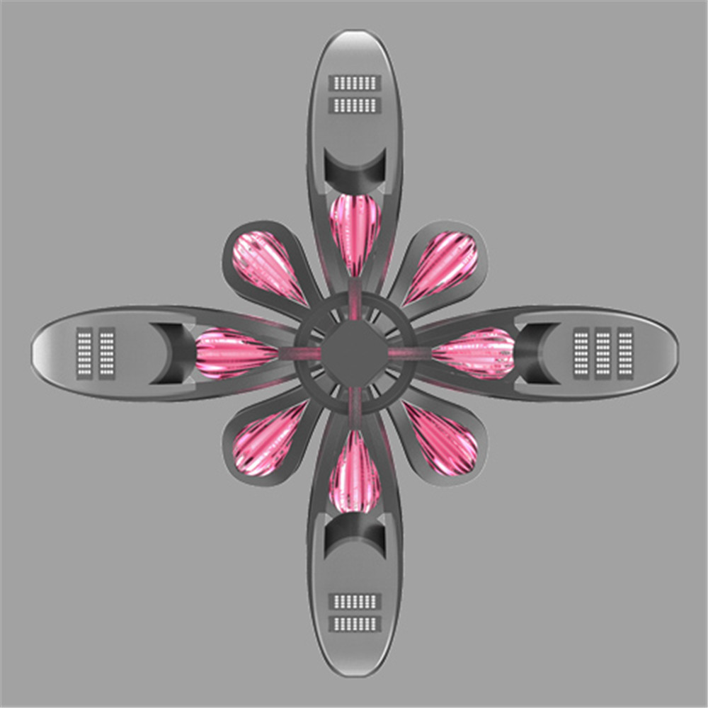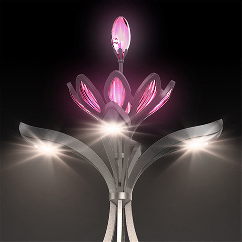 采用山茶花作為設計元素,燈桿設計成四桿花瓶狀,打破常規燈桿單一的樣式,主體分為功能照明和裝飾照明兩個部分,分別對應的是山茶花的葉子、花瓣和花蕾,彩色的裝飾玻罩白天具備一定景觀性,和道路綠化景觀的“四季有花賞”的設計策略相融合,夜晚呈現山茶花盛世開放的亮麗景致。